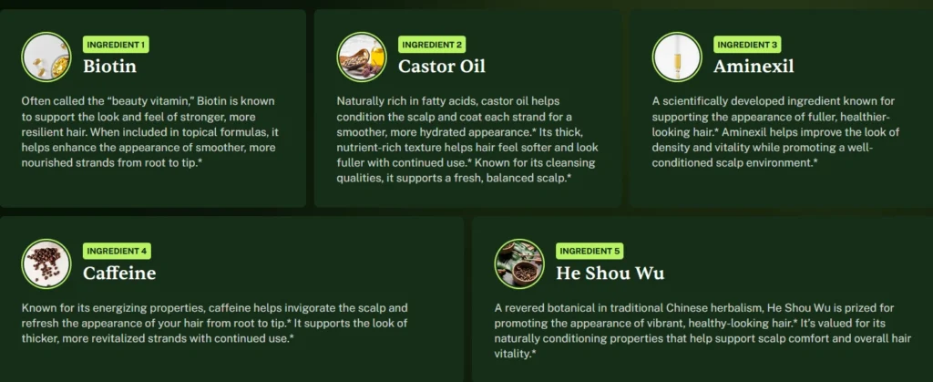 HaloGrow contains a proprietary blend of biotin, caffeine, ginger root extract, and He Shou Wu.